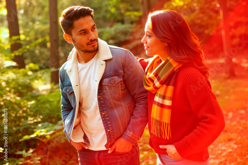 park, autumn, nature, couple, young adult, man, woman, hispanic, human relationships, romance, walk, conversation, connection, friendship, togetherness, smile, affection, casual attire, leisure, fall season, sunlight, forest, tree, happy, bond, dating, love, lifestyle, weekend, relaxation, enjoy, communication, emotion, warmth, foulard, jacket, jean, daylight, positive, interaction, care, trust, support, natural light