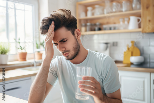 Young adult male holds a glass of water while pressing his forehead, showing signs of a headache or migraine in a bright, modern kitchen setting