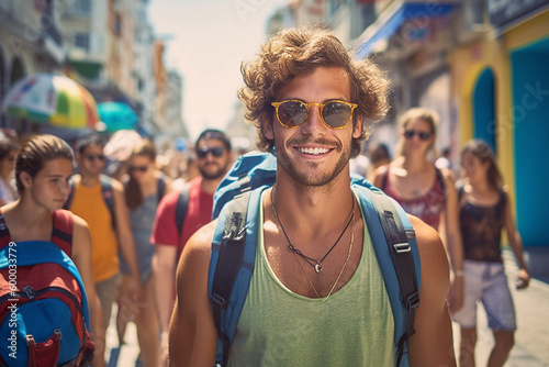 young adult man in a tourist street with many tourist people, fictional place. Generative AI