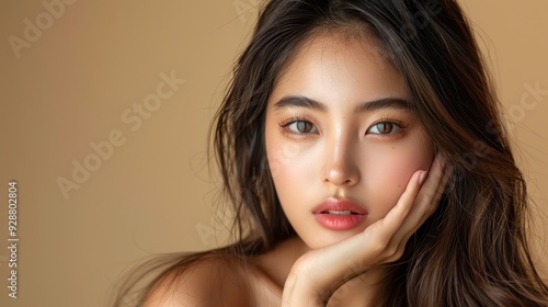 Young Asian beauty woman with long hair and Korean 022 woman, beauty, face, hair, model, fashion, eyes, makeup, brunette, skin, make-up, glamour, smile, person, brown, people, close-up, closeup, head