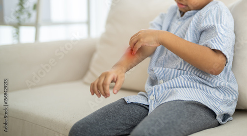 Young asian boy concerned expression itch or skin irritation, children allergy, particularly those related to skin care and health, childhood, health, skin care and medical attention daily life