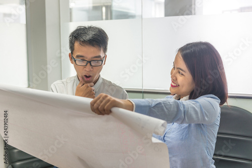 Young Asian business team working and discussing about new project on paper