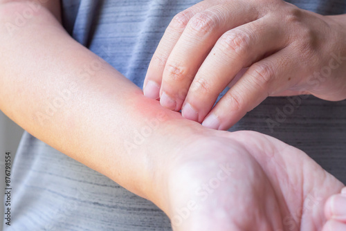 Young asian man itching and scratching on arm from allergic itchy dry skin eczema dermatitis insect bites