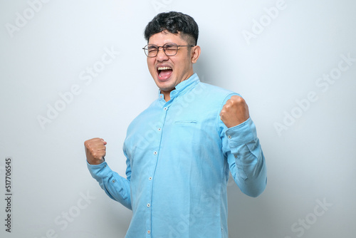asian, man, victory, excited, expression, celebrate, gesture, pose, confident, guy, joy, mouth, positive, shouting, standing, successful, smile, photogenic, glad, portrait, male, emotion, isolated, happy, winner, person, amazed, glory, triumph, shocked, wow, yell, raised, scream, arm, clenched, hand, lifestyle, indonesian, malaysian, thai, casual attire, shirt, surprised, student, eye, success, white