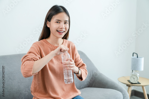 Young Asian woman holding water bottle and on the sofa at home.