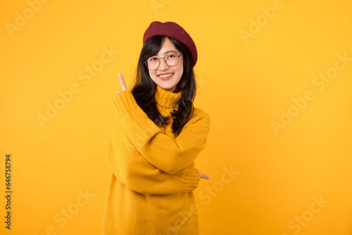 young Asian woman in her 30s, wearing a yellow shirt and red beret. happy face and pointing finger to free copy space against vibrant yellow backdrop. Unlock savings and shop now!