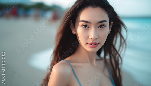 beach, bikini, vacation, asian, travel, summer, girl, young, lifestyle, holiday, woman, sea, female, beautiful, tropical, ocean, relax, person, water, people, sand, holiday maker, relaxation, nature, leisure, sun, beauty, swimwear, woman, swimwear, blue, adult, sky, hat, sunny, relaxing, sun tanning, slim, lady, pretty, healthy, model, portrait, body, sexy, hair, suit, ai