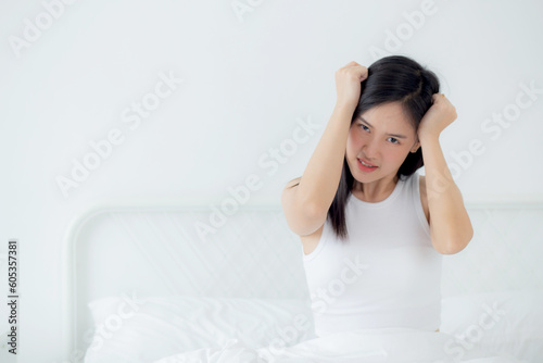 Young asian woman sitting on bed pain headache in the bedroom at home, unhappy female exhaustion and sick headache, anxiety and unwell, dizziness and disorder, medical and health concept.