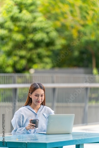 young, asian, woman, business, businesswoman, female, outdoors, using, laptop, computer, hot drink, sitting, table, office, building, digital, technology, wireless, remote, working, casual attire, clothing, relax, chilling, smiling, cheerful, contented, positive, people, blue, person, work, cyberspace, lifestyle, smile, men at work, desk, student, notebook, lady, workplace, electronic, banking, e-business, online, adult, professional