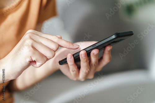 Young Asian woman using smartphone typing, chatting conversation. Social Network, technology concept