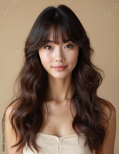 woman, female, girl, asian, model, brunette, hair, long hair, wavy hair, bang, fringe, attractive, pretty, beautiful, beauty, face, portrait, head, shoulder, background, skin, make-up, cosmetic, elegance, style, fashion, glamour, sensual, serene, calm, neutral, light, tan, youthful, looking, posing, studio, indoor, haircut, coiffure, korean, japanese, china, gentle, soft, natural, graceful, youth, carefree, simple