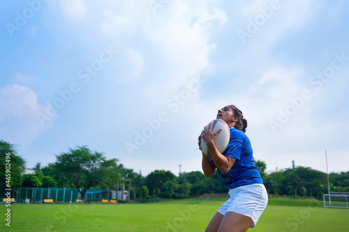 indian, sport, rugby, game, player, girl, athlete, practicing, playing, catching, footwear, ground, healthy lifestyle, fitness, recreation, blue, sky, sunlight, tree, female, adult, woman, young, day, half face, asian, one person, horizontal