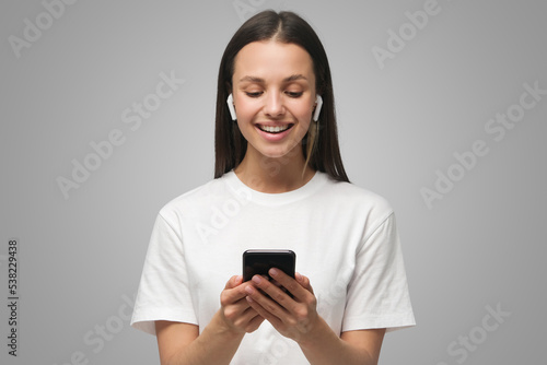 smartphone, girl, isolated, phone, woman, young, mobile phone, mobile, happy, use, mobile phone, looking, message, texting, communication, smart, technology, text message, text, laughing, smile, hand, female, pretty, attractive, beautiful, grey, background, studio, portrait, student, casual attire, 1, modern, white, t-shirt, t-shirt, face, model, adult, natural, blank, lady, people, earphones