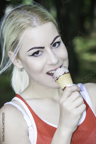 attractive, beautiful, blond, chocolate, city, clothes, cream, cute, eating, elegance, female, food, girl, happy, ice, lady, licking, people, smiling, street, style, summer, town, walking, woman, young