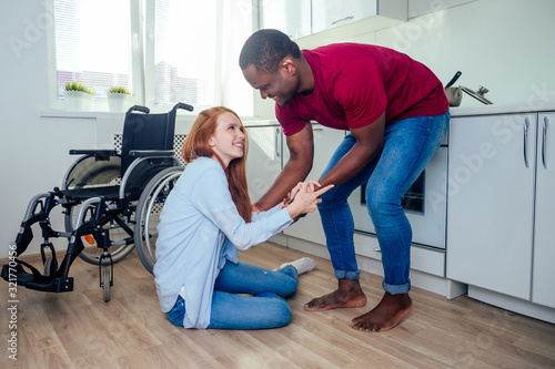 Young bearded handicapped redhaired ginger wife in wheelchair and her african american husband at kichen