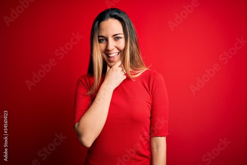 Young beautiful blonde woman with blue eyes wearing casual t-shirt over red background looking confident at the camera smiling with crossed arms and hand raised on chin. Thinking positive.