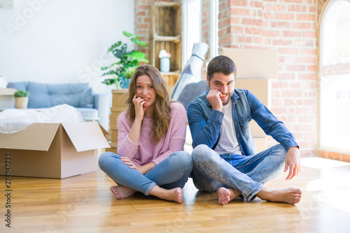 Young beautiful couple moving to a new house sitting on the floor looking stressed and nervous with hands on mouth biting nails. Anxiety problem.