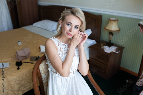 Young beautiful girl blonde bride in a sexy white boudoir dress dresses and gathers for a wedding ceremony in a hotel room while waiting for the groom. Love and lovestory.