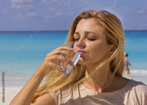 Young beautiful girl drinks water on the beach. Woman with a glass of water. Hot beach day.