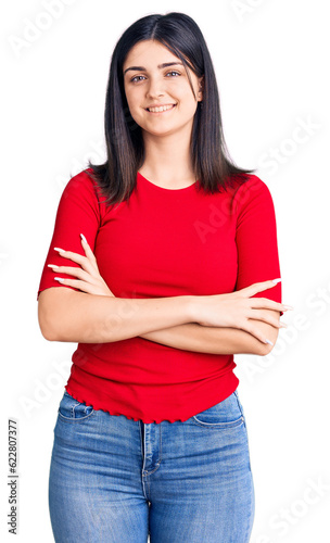 Young beautiful girl wearing casual t shirt happy face smiling with crossed arms looking at the camera. positive person.