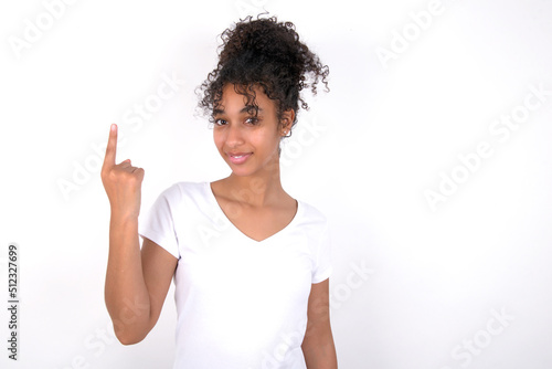Young beautiful girl with afro hairstyle wearing white t-shirt over white wall smiling and looking friendly, showing number one or first with hand forward, counting down