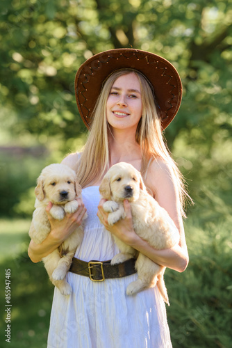 young beautiful girl with golden retriever dogs and labrador golden retriever puppies on a picnic in the park. Dogs for sale. best Soak breed. Golden retriever puppies