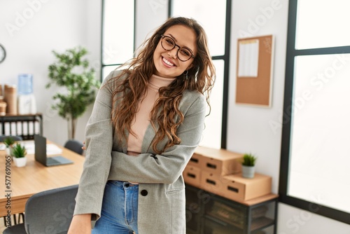 Young beautiful hispanic woman business worker smiling confident standing with arms crossed gesture at office