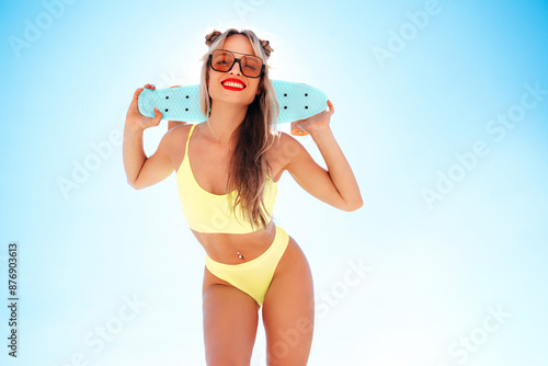 Young beautiful smiling blond woman posing in the street in sunny day. Sexy model in swimwear bathing suit. Positive female with red lips. Holding penny skateboard. Happy and cheerful, blue sky behind