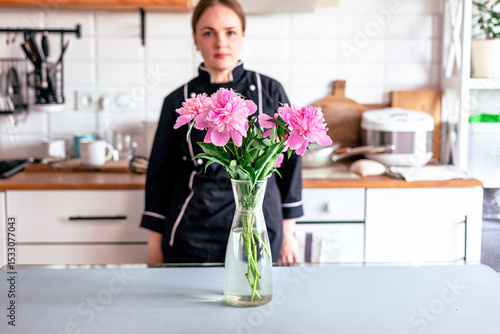 young beautiful woman chef in black uniform with flowers in a vase standing in kitchen.