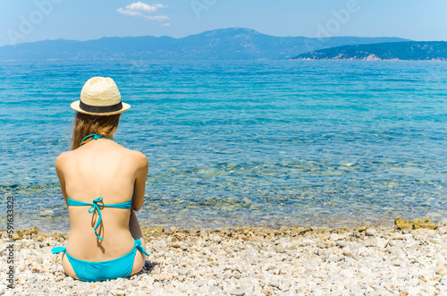 young, woman, sun tanning, beach, long, hair, bikini, hat, blue, tropical, exotic, sun, sunny, sea, shore, tree, sky, green, water, croatia, dalmatia, fun, health, summer, vacation, holiday, hot, day, rock, stone, calm, peaceful, zen, sunbath, girl, teenage, beautiful, skin, swimwear, people, attractive, female, travel, happy, destination, tour tourism, tan, background, rest