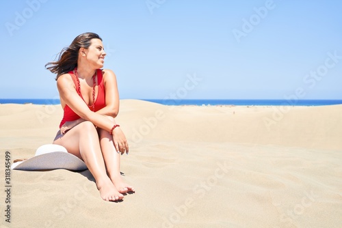 Young beautiful woman sunbathing sitting on the sand wearing summer swinsuit at maspalomas dunes bech