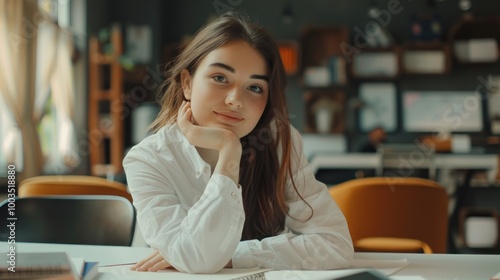 Young beautiful woman wearing a white shirt leaning on the table AI generated image