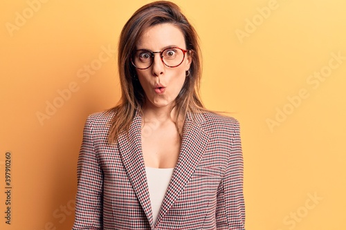 Young beautiful woman wearing business clothes and glasses scared and amazed with open mouth for surprise, disbelief face