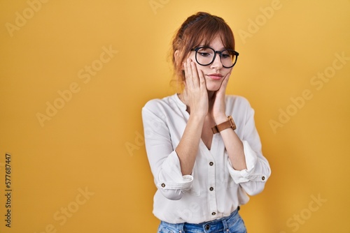 Young beautiful woman wearing casual shirt over yellow background tired hands covering face, depression and sadness, upset and irritated for problem