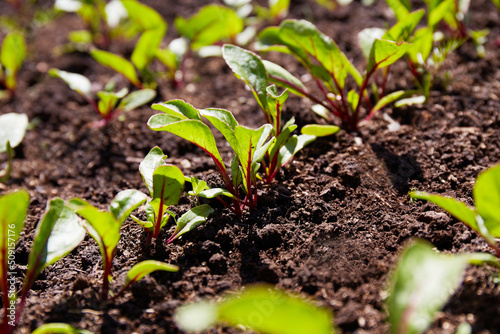 Young beet sprouts in the garden. Organic farming. Selective focus