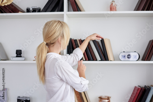 Young blond woman, wearing casual jeans and white top, standing near book shelves in the office room. Freelancer employed at home. Work process in modern company office. Young successful professionals