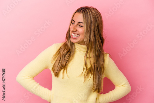 Young blonde caucasian woman isolated on pink background laughs and closes eyes, feels relaxed and happy.