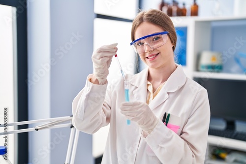Young blonde woman wearing scientist uniform measuring liquid on test tube at laboratory
