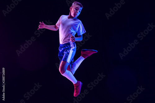 Young boy as a soccer or football player in sportwear making a feint or a kick with the ball for a goal on dark studio background. Fit playing boy in action, movement, motion at game. Purple neon