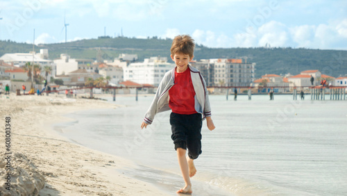 Young boy runs on the sandy beach under the bright, sunny sky, feeling carefree and alive.
