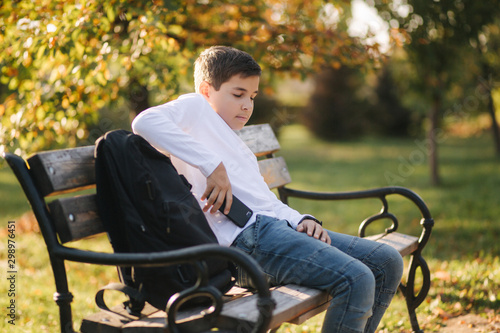 Young boy take out of his pocket smartphone. Teenage boy sitting on the bench in the park