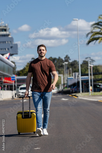 young boy walking with his suitcase at the airport to go on a trip