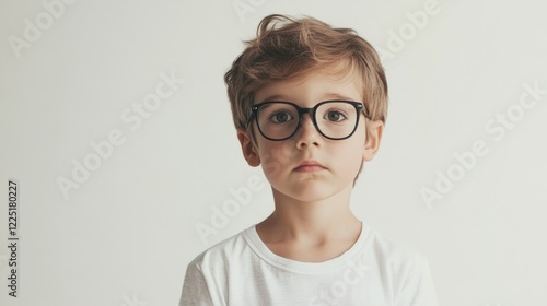 Young boy with glasses and light brown hair looking at the camera against a plain background Copy Space