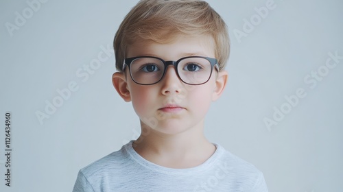 Young boy with glasses in casual attire posing against a neutral background showcasing intelligence and innocence in a close-up shot.