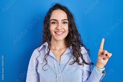 Young brunette woman standing over blue background showing and pointing up with finger number one while smiling confident and happy.