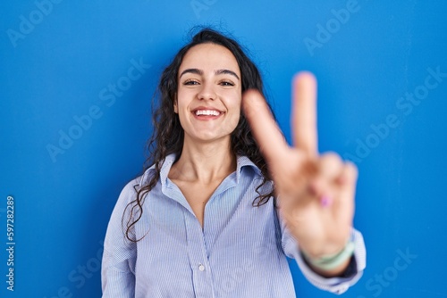 Young brunette woman standing over blue background smiling looking to the camera showing fingers doing victory sign. number two.
