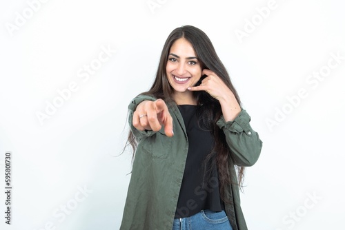 young brunette woman wearing casual clothes over white studio background smiling cheerfully and pointing to camera while making a call you later gesture, talking on phone