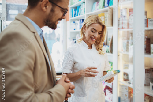 Young business man choosing and buying drugs in a drugstore while talking with attractive female pharmacist. She helping him with expert advices.