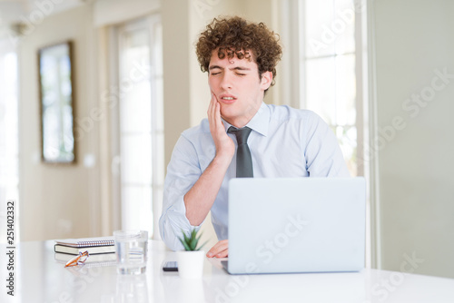 Young business man working with computer laptop at the office touching mouth with hand with painful expression because of toothache or dental illness on teeth. Dentist concept.