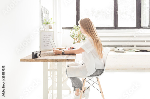 Young business woman working at home behind a laptop. Creative Scandinavian style workspace